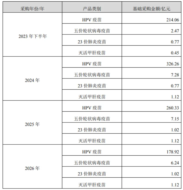 第一,取消基础采购金额,滚动采购取代刚性对赌。这是本次调整最具决定性的改变。2023年1月双方签署的原协议约定,2023年下半年至2026年上半年,智飞生物需完成超980亿元的基础采购,其中2024-2026年HPV疫苗保底采购额分别高达326.26亿元、260.33亿元、178.92亿元,近乎“刚性对赌”。