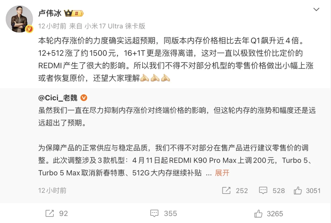 卢伟冰也跟进表态:同版本内存价格相比去年 Q1 飙升近 4 倍,12+512 涨了约 1500 元,16+1T 更是涨得离谱,"对一直以极致性价比定价的 REDMI 产生了很大的影响"。
