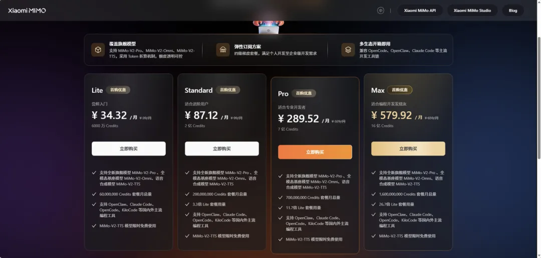 套餐分四档:Lite(¥39/月)、Standard(¥99/月)、Pro(¥329/月)、Max(¥659/月),单次订阅可调用 MiMo-V2-Pro、MiMo-V2-Omni 和 MiMo-V2-TTS 三大模型。
