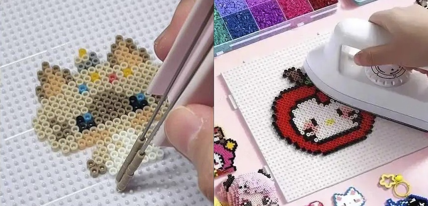 拼豆的“豆”,其实是小塑料管。玩家按照图纸,在带孔模板上将豆子排列好,再用熨斗或专门的烫画机熨烫,经过热熔后,塑料豆子之间的缝隙会被弥合,一颗颗小豆子就变成了一个整体。