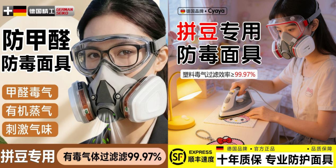 高温熨烫豆子会产生有害气体,很多玩家将头晕等症状归结为长时间久坐,其实是吸入了有害气体所致。这也带来了新的商机——拼豆专用面罩。