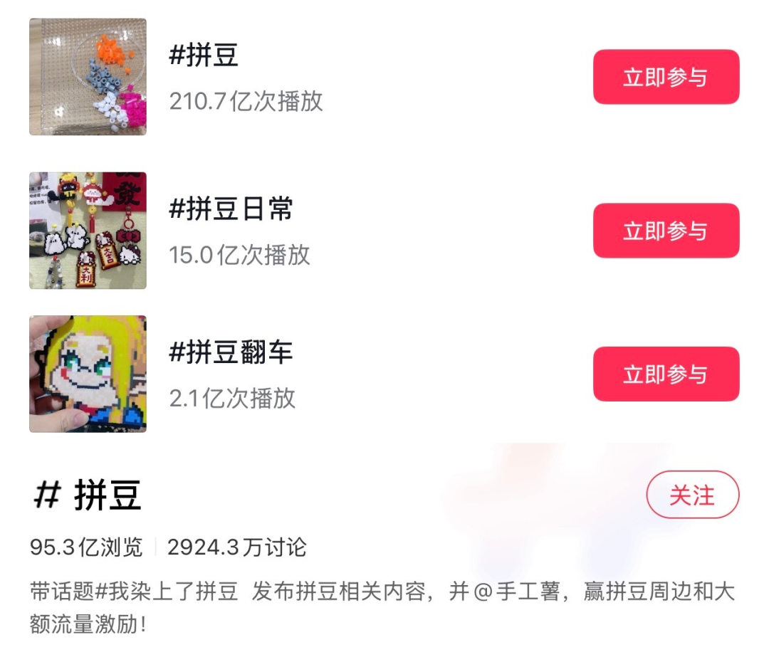 进入2026年,拼豆的热度继续增长。抖音平台上“拼豆”话题视频播放量已突破200亿次,过亿播放的相关话题超过10个;小红书拼豆话题浏览量近百亿;微博上也有多个阅读量过亿、讨论量数万的相关话题。