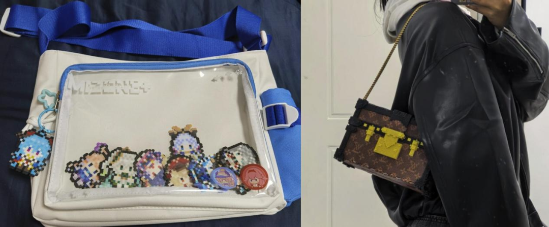 挂满拼豆的痛包和拼豆版背包;图片来源:小红书