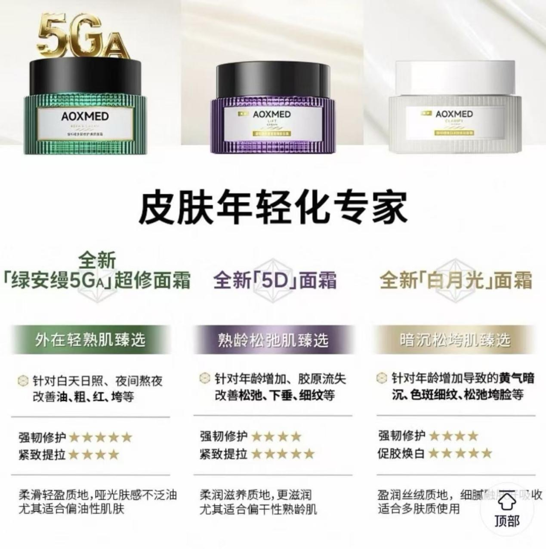 绿安缇系列添加胶原组合满足轻熟肌外在修复需求,5D系列以超导双肽+绿绒蒿精粹应对熟龄肌紧致提拉需求,白月光系列则用花榈木精粹、烟酰胺、麦角硫因等成分解决暗沉松垮肌的美白淡斑需求。