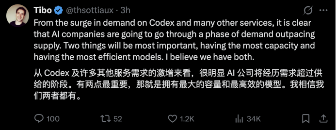 Codex工程负责人Thibault Sottiaux则表示:AI公司即将进入“供不应求”的阶段,谁拥有更多算力,谁的模型更高效,谁就能在这场竞赛中胜出——而他们(OpenAI)两者都有。