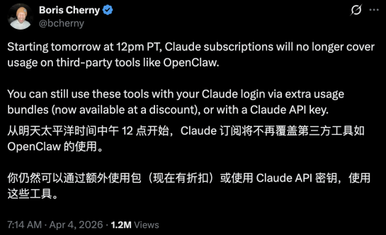 从4月4日起,你不能再用Claude订阅额度跑第三方工具(比如OpenClaw),想继续用,只能按量付费。