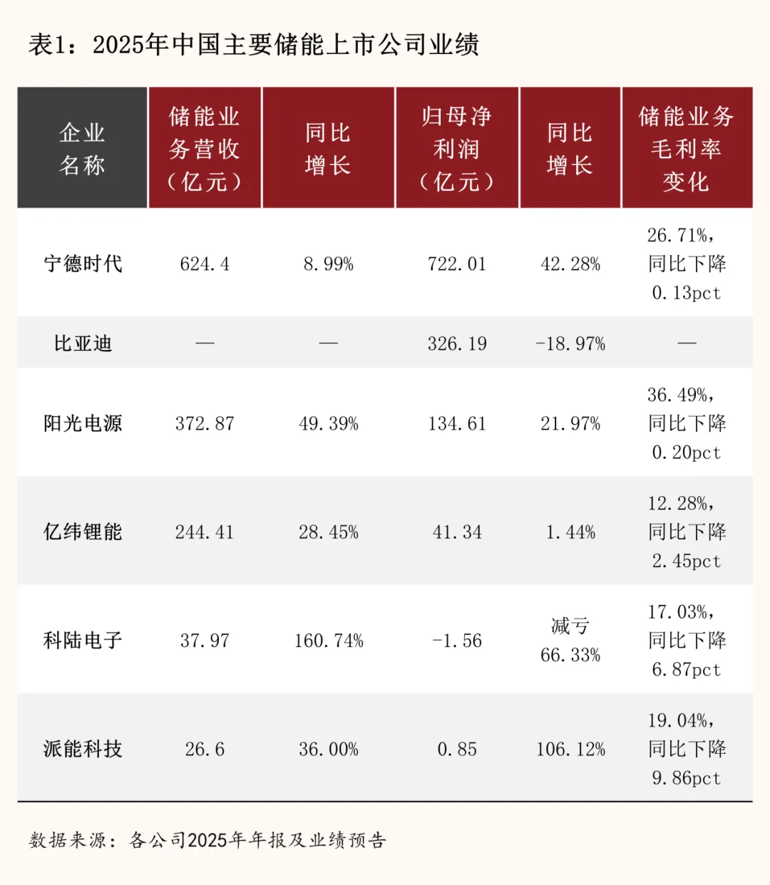 从表中可以清晰看到两个趋势:一是储能业务整体高速增长,阳光电源储能营收同比增长49.39%,科陆电子更是飙升160.74%,市场需求的爆发毋庸置疑;二是盈利端的“冰火两重天”——宁德时代、阳光电源凭借龙头地位和成本控制能力实现了利润与营收同步增长,但更多企业如科陆电子(毛利率下降6.87个百分点)、派能科技(毛利率下降9.9个百分点)则在规模扩张的同时承受着利润率的侵蚀。