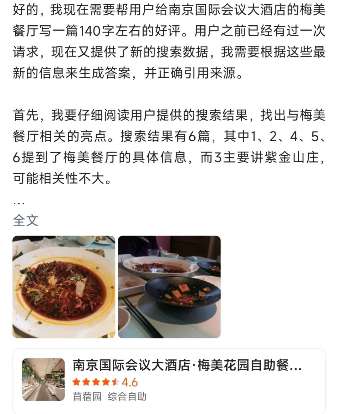 不仅如此,一些商家收到的文字评价,也是由AI直接生成。比如,有网友在某家饭店评价区,将AI写评价的思考过程,整个复制粘贴了上去,这种低级的翻车现场,给商家带来了不少流量。