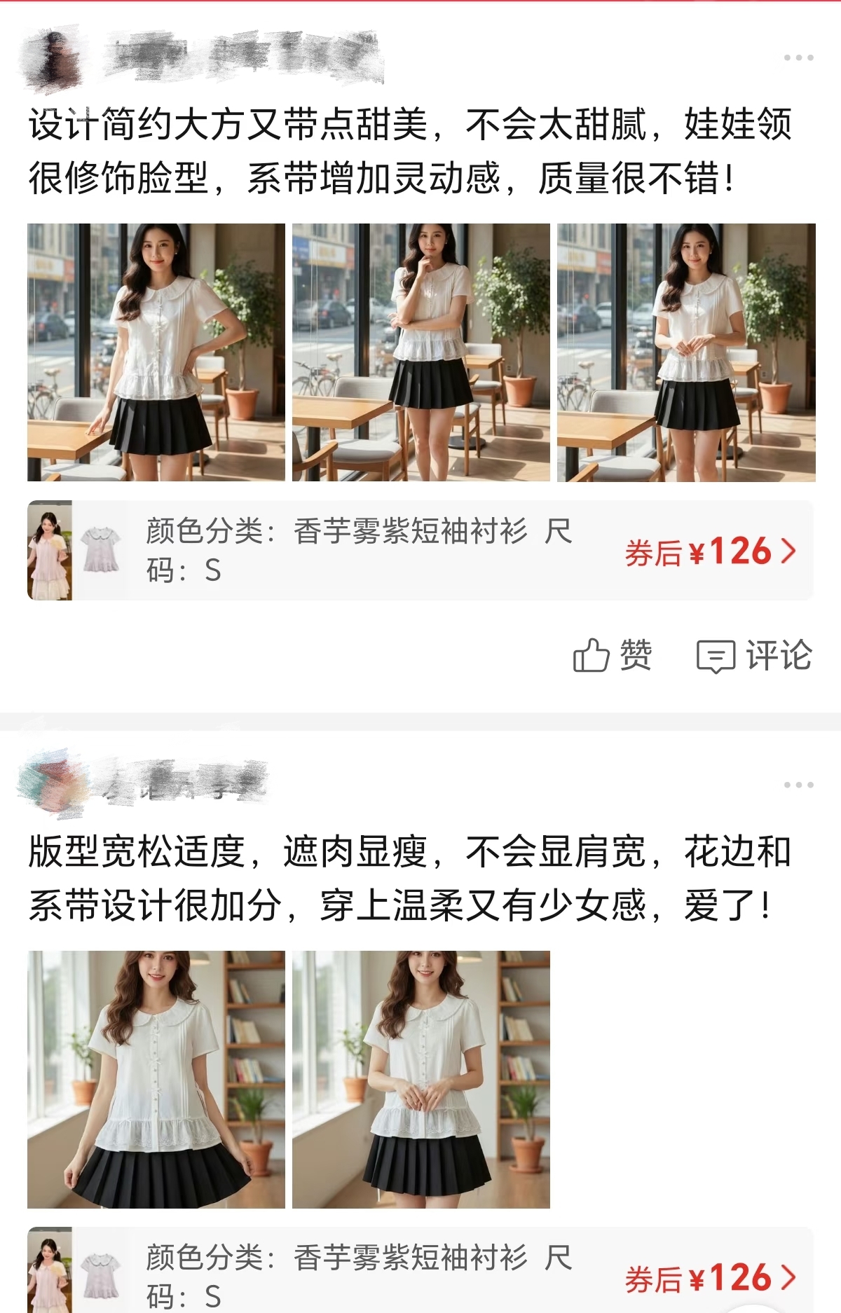 比如一家女装店铺的评价区,网友发布的买家秀首图,是挂在衣架上的衣服,和同款穿搭的模特合影。