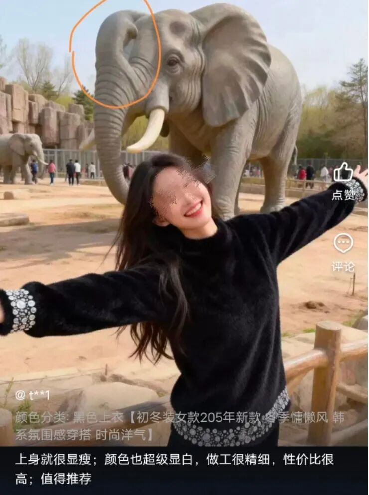 而在某冬装店铺评价区,背景里的大象头部变异,就连网红疆域阿力木来了,可能都要说一句:“你这背景太假了。”