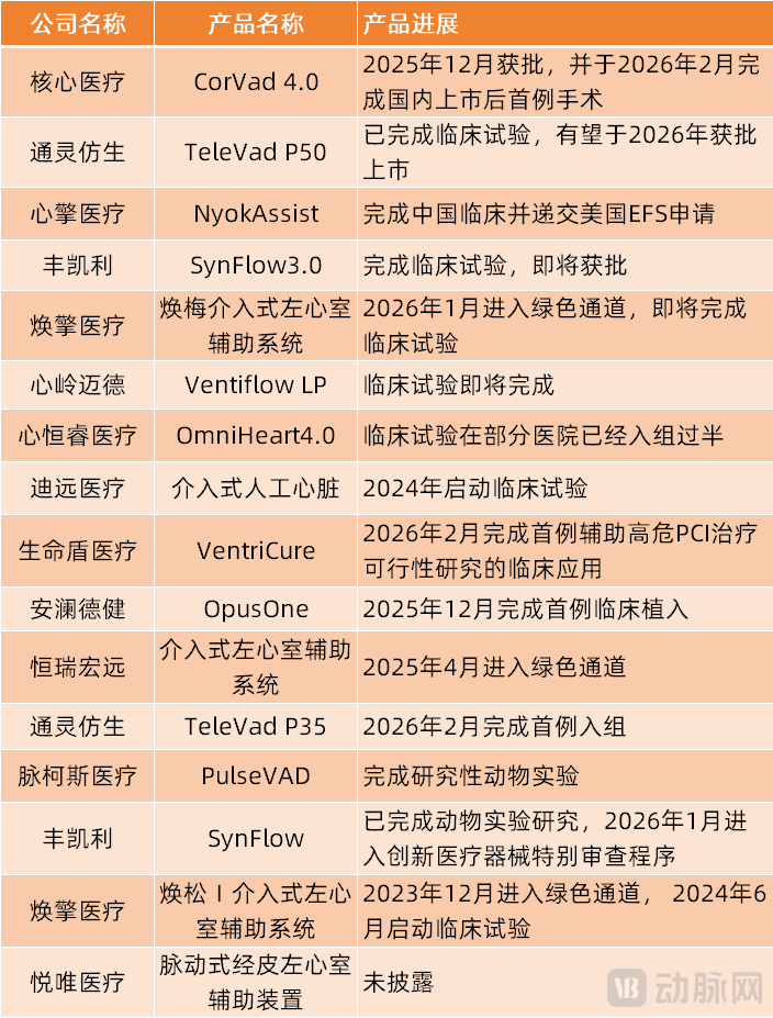 除了核心医疗和Abiomed,国内有十余家企业布局了介入式人工心脏,其中多家企业的核心产品已完成临床试验或即将步入收尾阶段,大概率将于2026年获批上市。