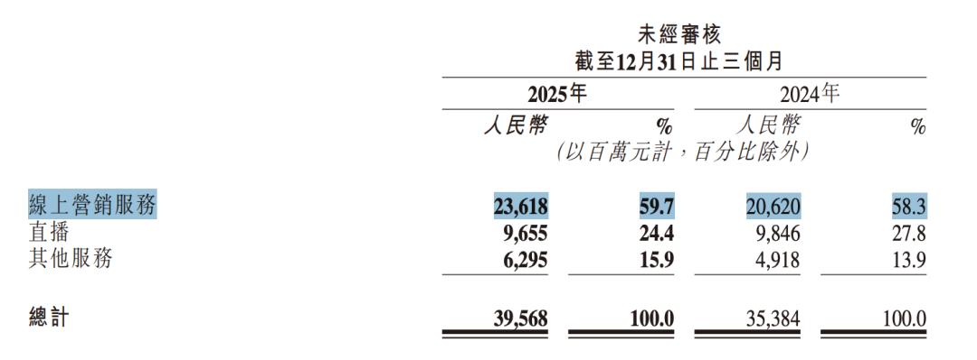 快手2025年全年的线上营销服务收入814.62亿元,同比增长12.49%;四季度线上营销服务收入达到236.18亿元,同比增长14.54%;整体来看四个季度增速均稳定在12%-15%区间。