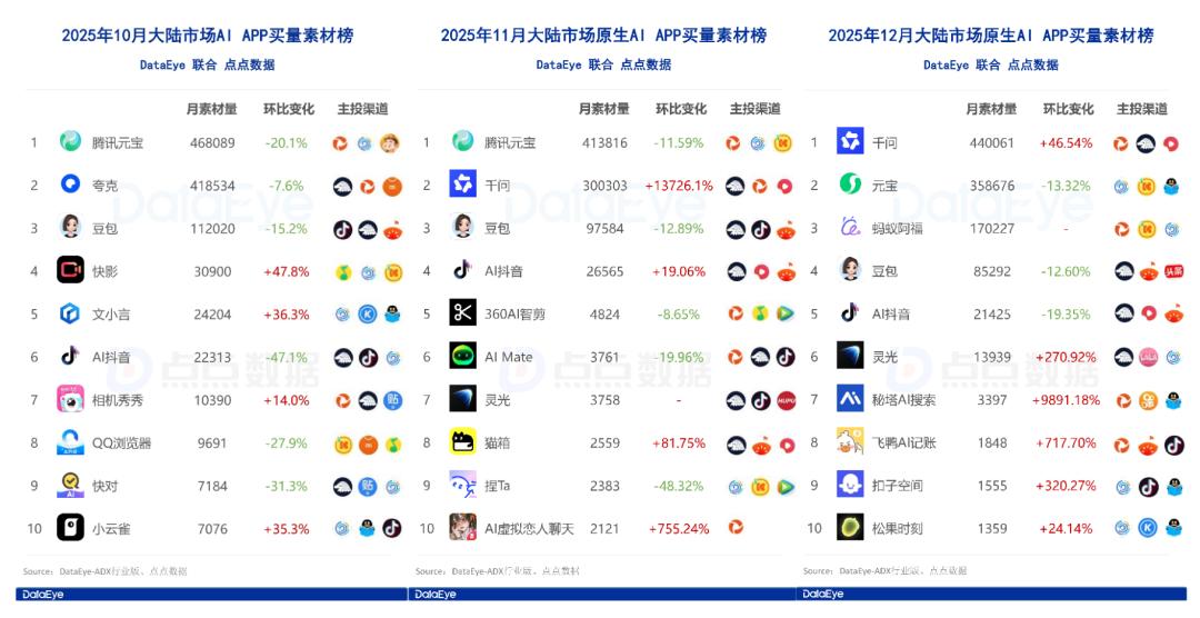 根据DataEye和点点数据联合报告,豆包、夸克、千问、Kimi、星野等非腾讯系APP都是腾讯广告忠实拥趸。