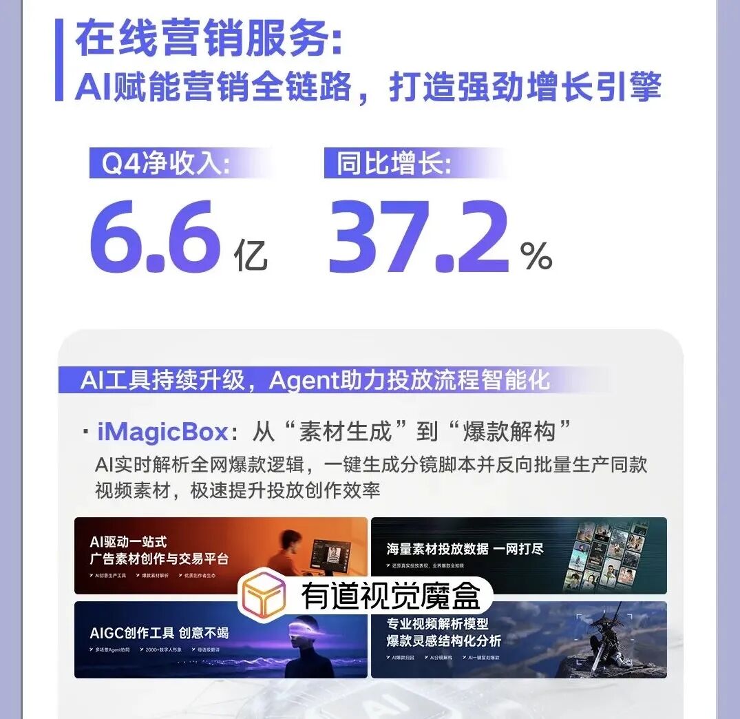 公司将增长归因于网易集团内部需求与海外市场扩展,同时也明确提到这背后是得益于持续的AI技术投入显著提升了广告投放效率。包括AI广告投放优化师、iMagicBox等工具,正帮助其在程序化广告与KOL营销中实现更高的转化效果。