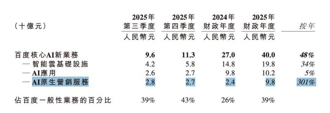 值得注意的还有,从2025年第三季度开始,百度引入了“AI原生营销服务”这一全新披露口径。在这一维度下,2025年相关收入较2024年全年增长301%,释放出“AI正成为核心驱动力”的强烈信号。