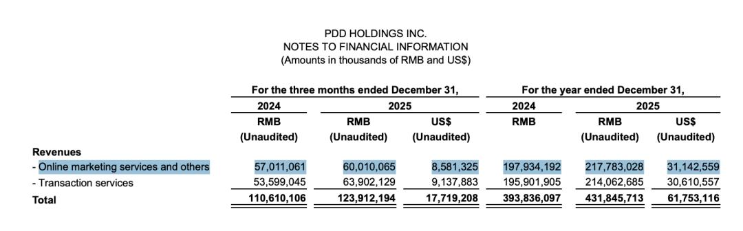在2023年之前,其在线营销服务收入曾长期保持50%左右的高速增长,但从2024年开始逐步回落,至2025年第四季度收入600.10亿元,同比增速已降至5.26%。2025全年在线营销服务收入为2177.83亿元,同比增长10.03%。