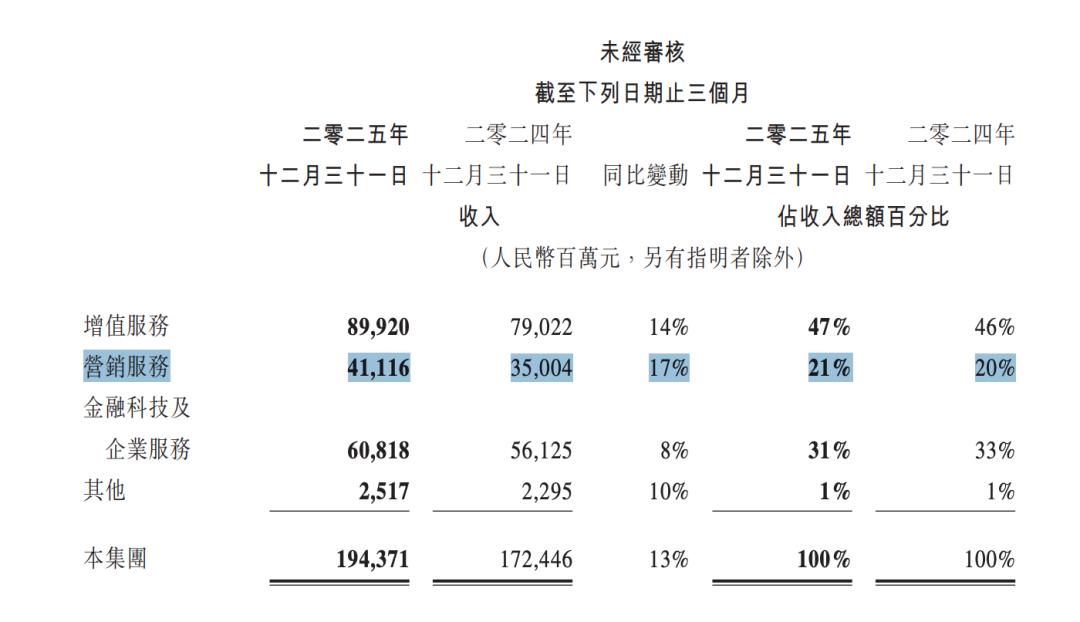 以腾讯为例,2025年其营销服务收入达到1449.73亿元,同比增长19%;其中四季度收入411.16亿元,同比增长17%。对于腾讯广告这样的体量基数,双位数的增长是非常恐怖的。