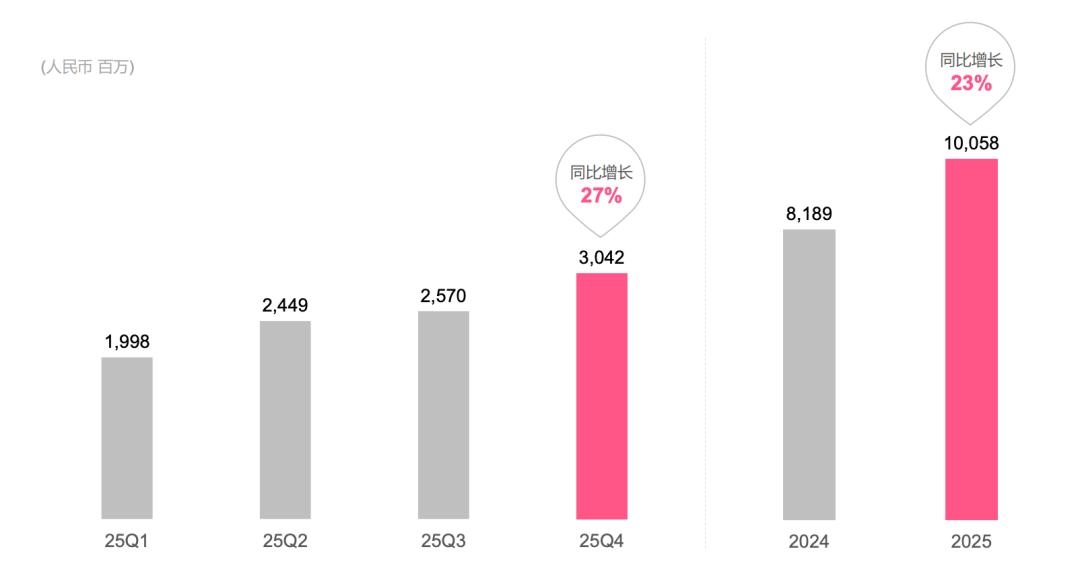 哔哩哔哩2025年四季度广告收入达到30.42亿元,同比增速达27%。全年广告收入100.58亿元,同比增长23%,是少数持续保持20%以上增速的公司。