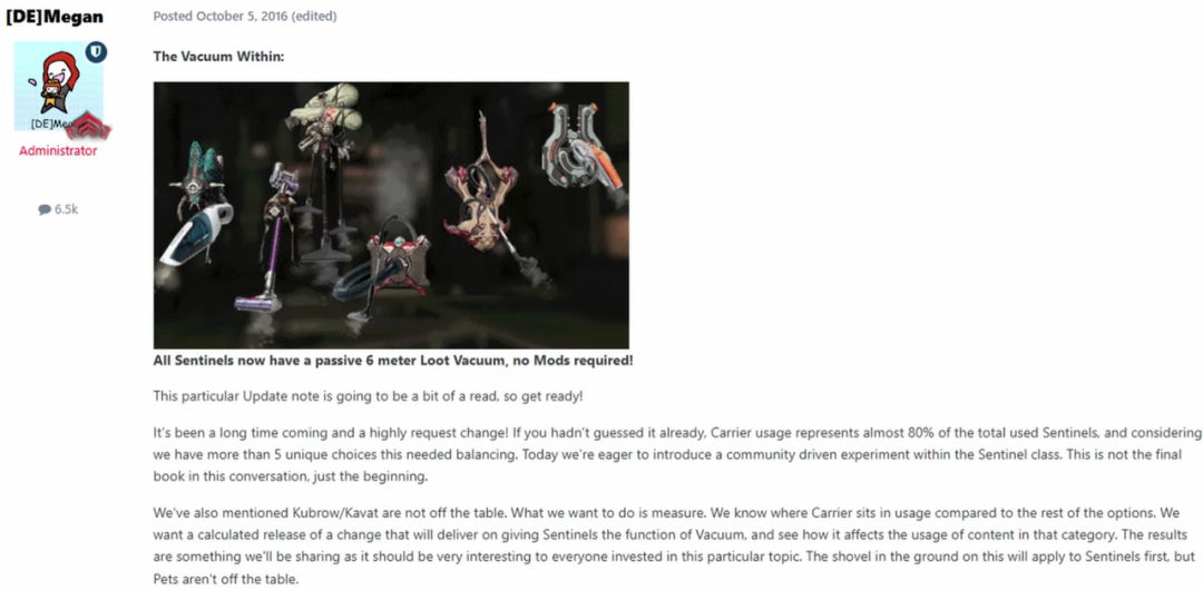 比如发生在2013年到2016年间的吸取物机制的争执,当时游戏里有个叫“吸取”的模组,能自动大范围捡地上的东西,但它是“搬运者”这个特定守护同伴的独有技能。因为《星际战甲》的核心玩法特别依赖刷材料,导致全服超过80%的玩家只带“搬运者”。