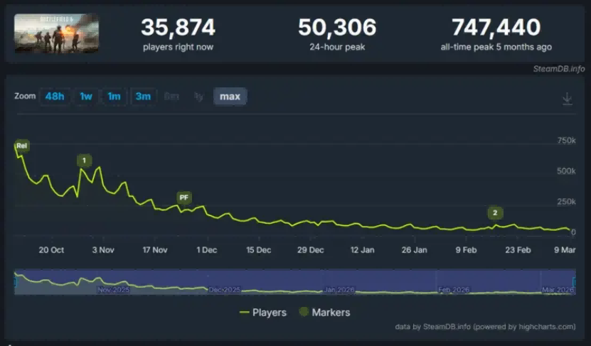 比如《战地6》为例,2025年10月开售后,靠着IP号召力短暂冲上热销榜前列,但因为严重的匹配问题、职业定位模糊,以及平衡性灾难,留存率一直上不去,没能建立起有效的长线粘性。