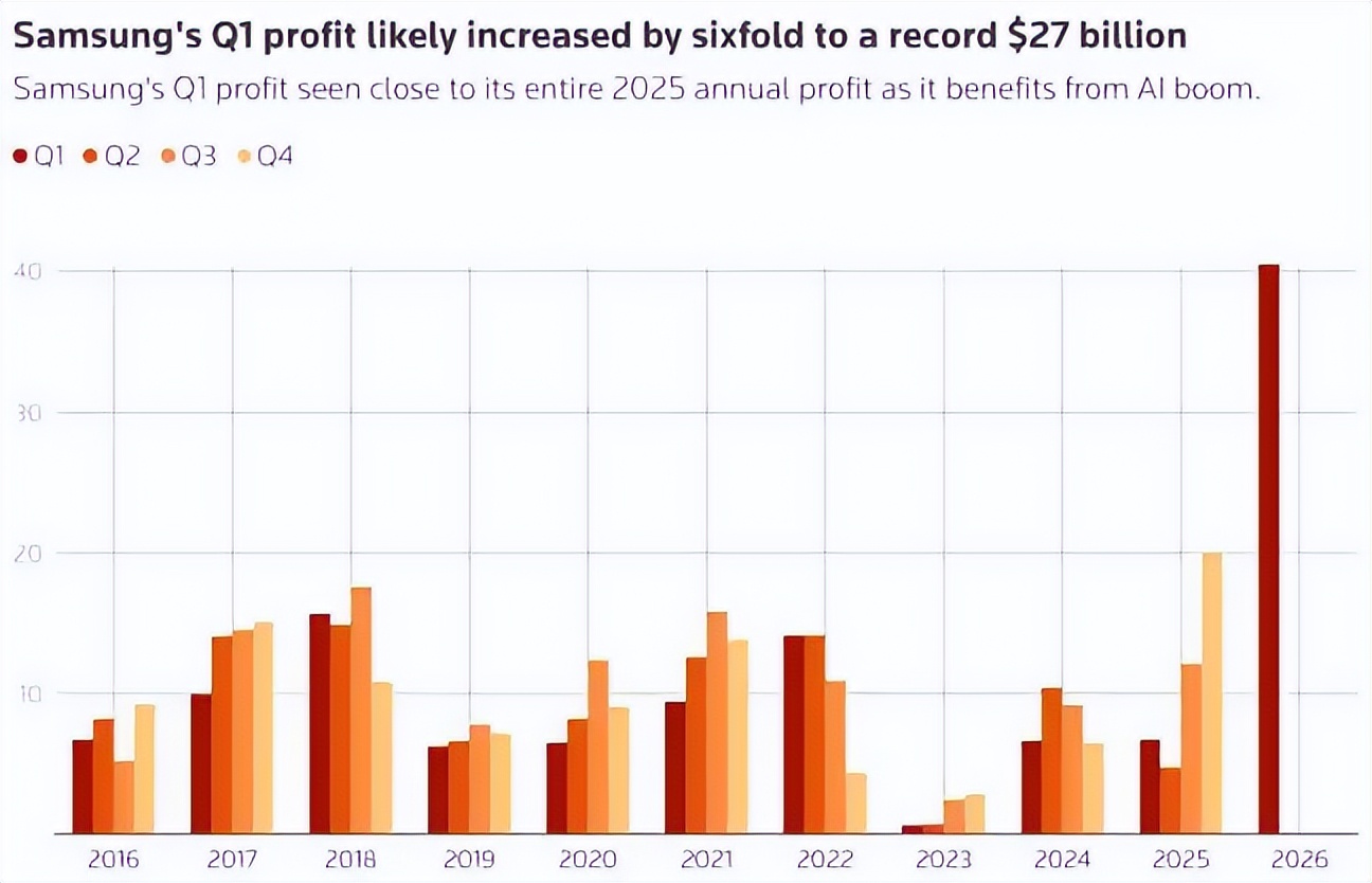 这一成绩刷新了三星季度盈利历史纪录,更超越了2025年全年43.6万亿韩元(约合1990亿元人民币)的营业利润,创下韩国企业史上最具爆发力的单季盈利表现。