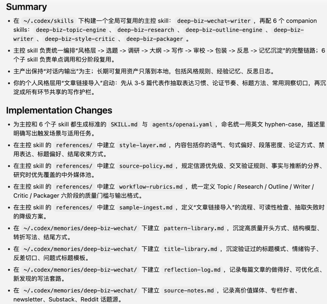 最近,我做了一个写商业分析文章的Agent,就跟codex对话(龙虾和Claude Code也一样),让它做选题——信息获取——框架——撰写——审校的工作流,Codex在接到我的部署之后开始写代码,一个一个地创建skill。