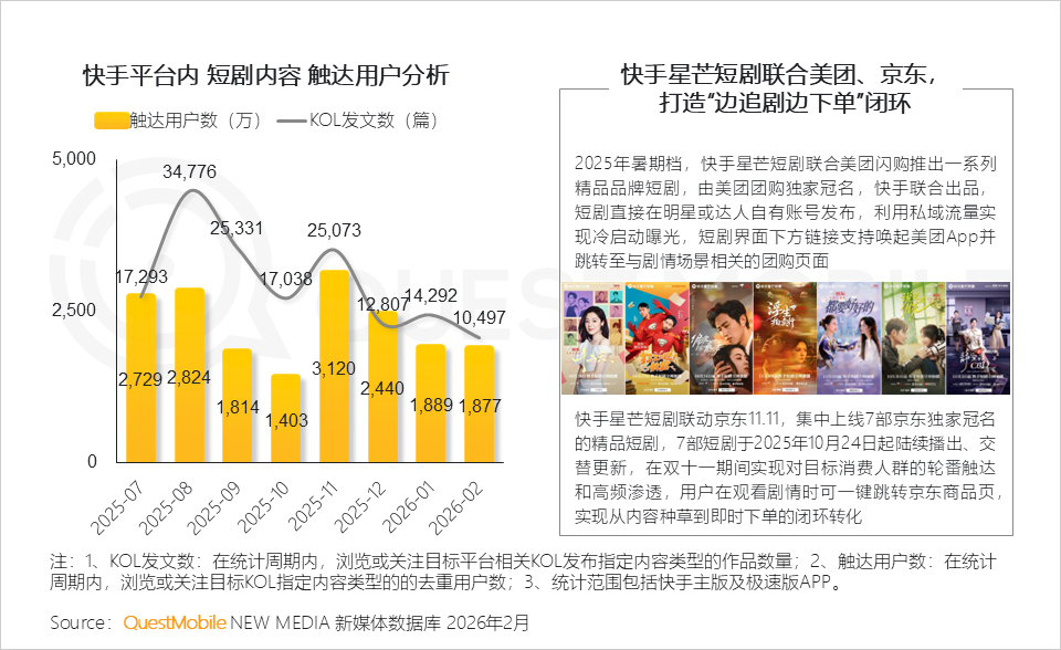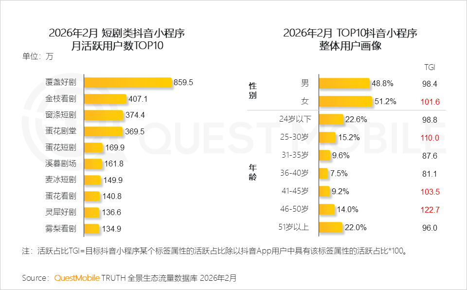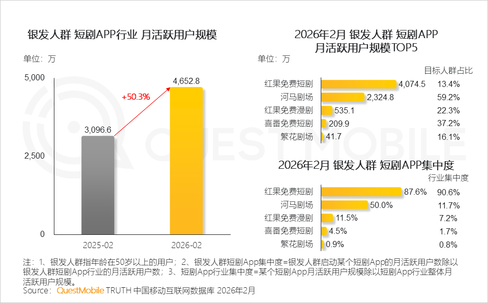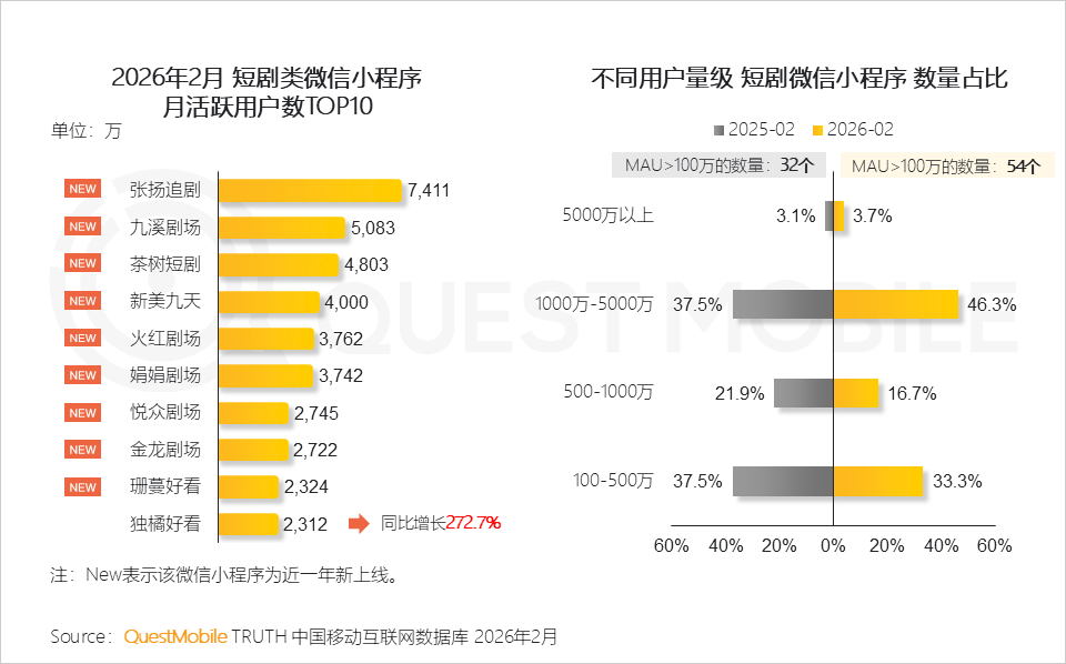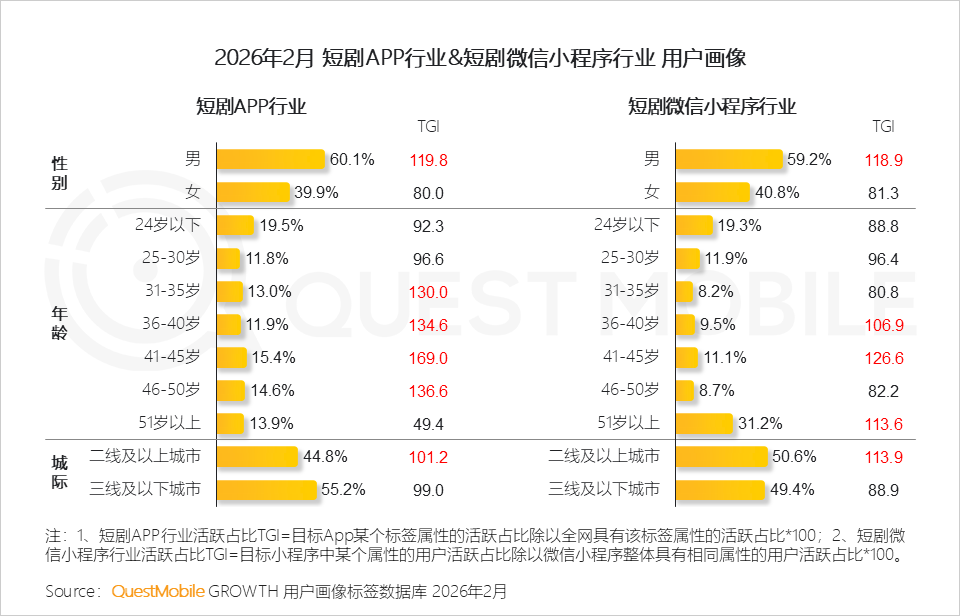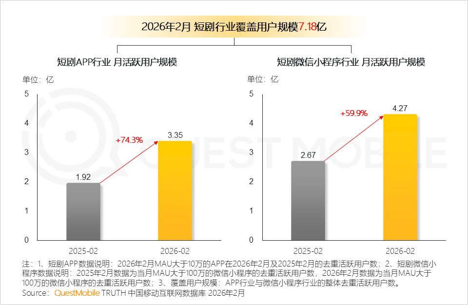 QuestMobile数据显示,2026年2月,短剧独立APP整体月活用户已达3.35亿,同比增长74.3%;微信小程序渠道用户规模达到4.27亿,同比增长59.9%。