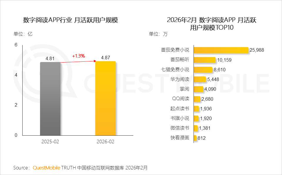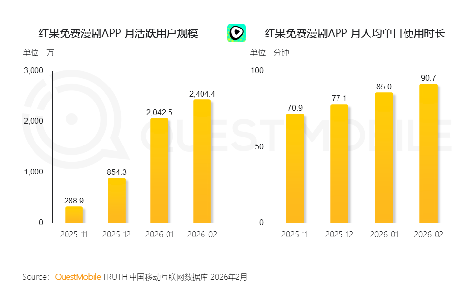 QuestMobile数据显示,2026年2月,红果免费短剧APP月活跃用户规模突破3亿大关,达到3.04亿,同比净增近1.4亿。