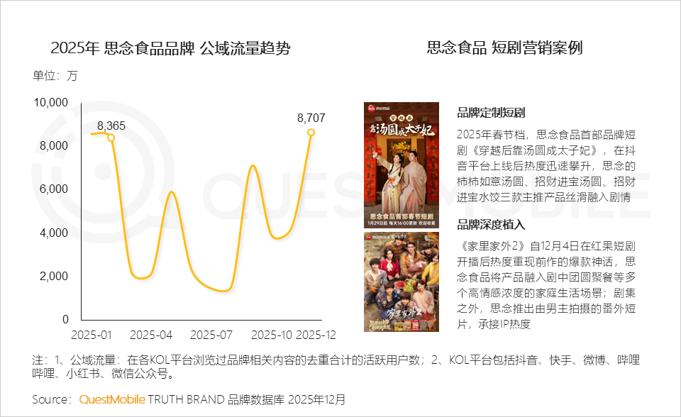 2、短剧上线后热度迅速攀升,直接带动思念视频品牌公域流量达到高峰,深度场景植入更易引发用户共鸣,提升品牌好感度与购买欲