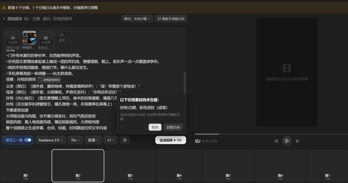 此外,AI编导还可凭借上下文的衔接和剧本描述自动生成场景、道具素材,无需用户额外寻找素材、手动剪辑,全程闭环操作。