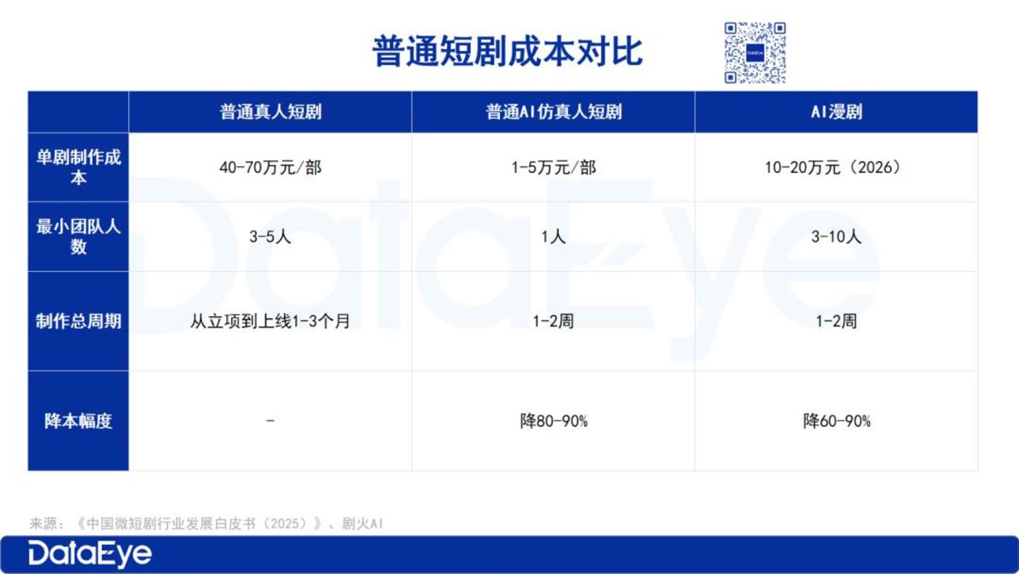 但如果是按照普通短剧的制作水平,每集3分钟,25集的内容,算上调试优化的积分损耗,制作1部短剧大约需要1-1.5万元的价格。这个价格相较于真人短剧的拍摄和制作,成本大幅度减低。而《中国微短剧行业发展白皮书(2025)》数据显示,普通真人短剧的制作成本约在40-70万左右。