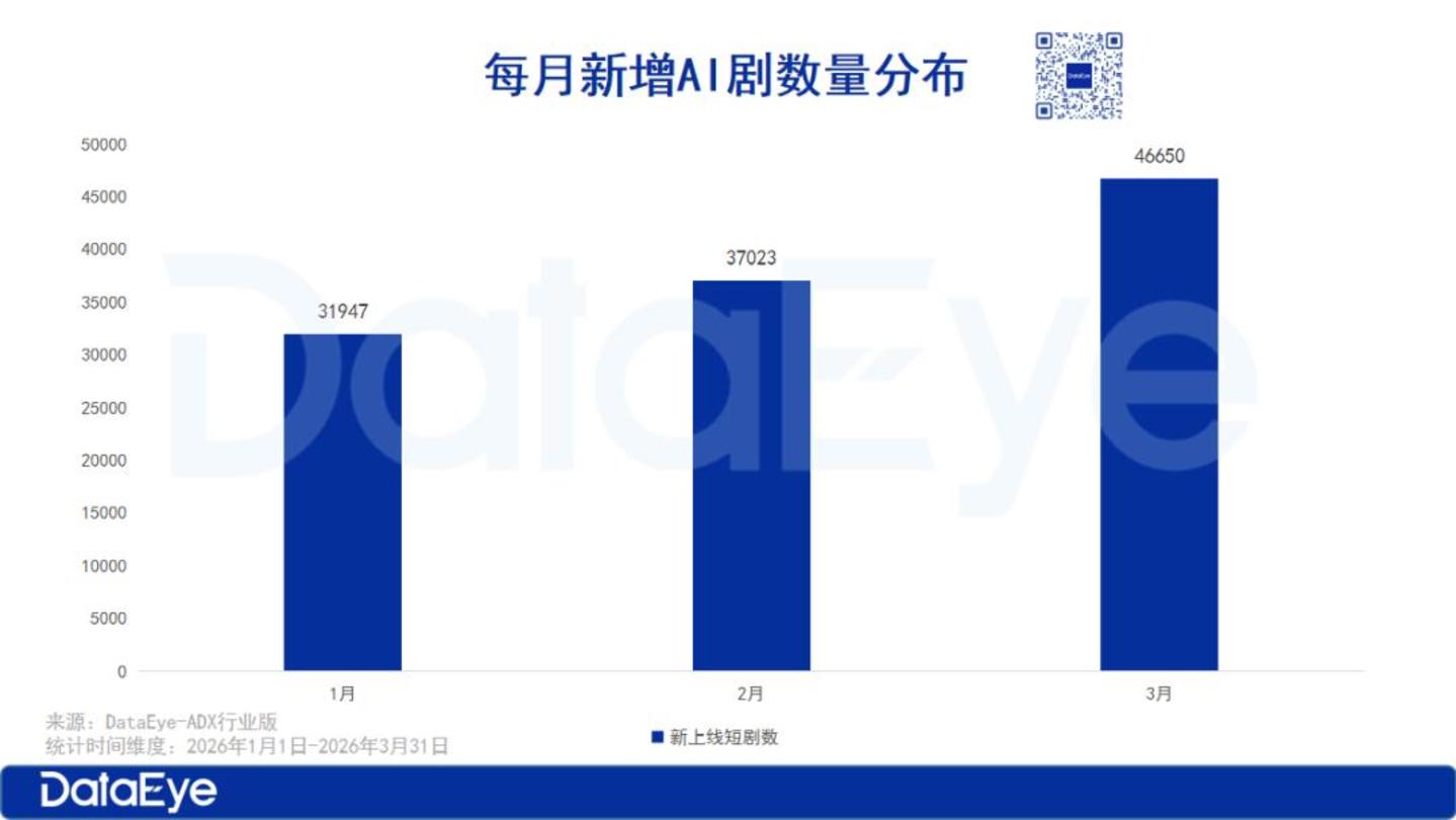 DataEye-ADX数据显示,3月新上线的AI剧数量共46650部,相较于2月新上线AI剧数量,提升了9627部,环比2月增长26%。而从在播漫剧数据来看,截止3月共有17.9万部漫剧在播,2026年Q1新增的漫剧数达11.9万部,AI剧产能正持续加速释放,成为行业增长的核心动力。