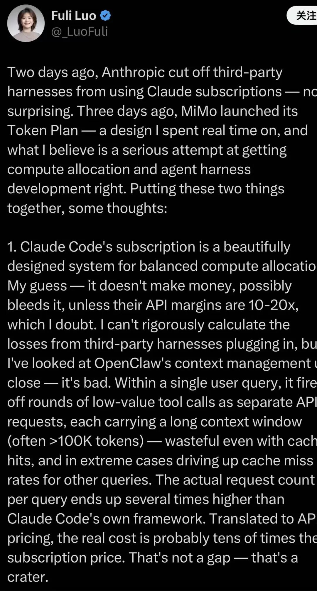 “Claude Code的订阅机制在计算资源分配上设计得非常漂亮。但我认为它并不赚钱甚至可能亏损,除非API利润率高出10到20倍。”在文中,罗福莉这样分析道。