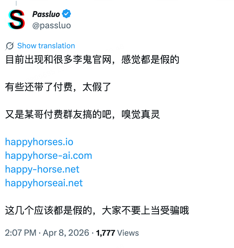首先要郑重提醒,Happyhorse目前没有可信的官方社交账号,没有官网,在圈内讨论热度下,已经有不少冒充网站出现。