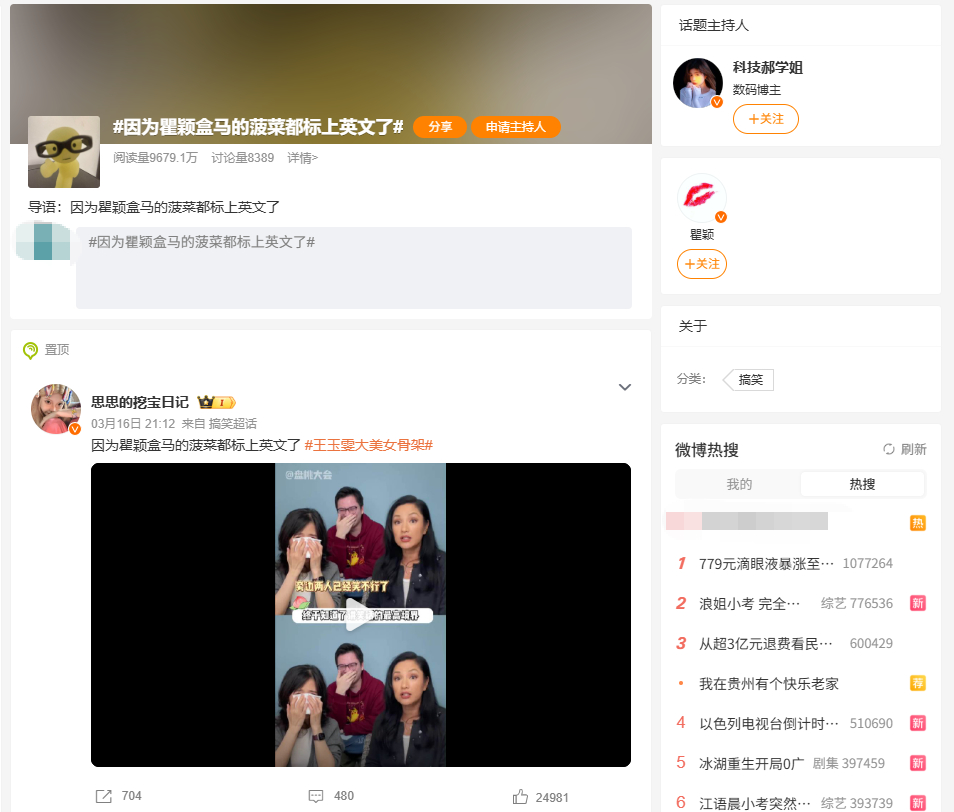 就在23天前的3月16日,盒马还曾因“菠菜梗”登上微博热搜。相关词条出自知名博主papi酱的访谈节目《papi热烈欢迎》。演员瞿颖在参加该节目时,描述自己曾将泰国摊主询问的“菠菜(Spinach)”误听为“西班牙人(Spanish)”,还现场模仿泰式口音。节目视频爆火出圈,在抖音、快手、小红书等平台累计点赞量超过135万。盒马迅速跟进,特地在应用端的菠菜商品描述中添加了“菠菜Spinach”的标签,“因为瞿颖盒马的菠菜都标上英文”话题随之在微博蹿红。