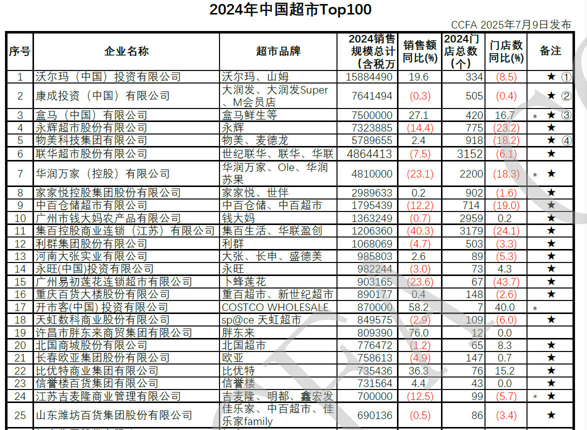 据中国连锁经营协会2025年7月发布的2024年度国内超市TOP100榜单,盒马跻身国内第三,第一是沃尔玛,第二是大润发背后的康成投资,再后面是永辉、物美、华润万家等。而在2023年与2024年发布的同维度榜单上,盒马排在第六与第八位。换言之,盒马业内座次已有明显提升。