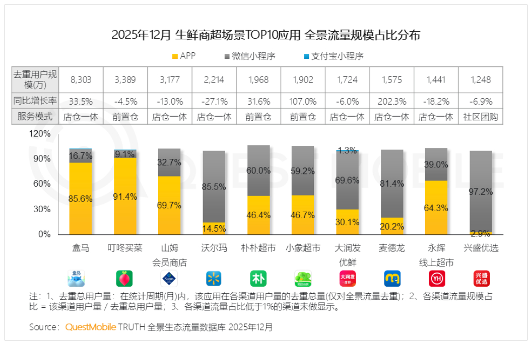 调研机构QuestMobile数据显示,在2025年12月国内生鲜商超场景应用榜单上,盒马以MAU(月活跃用户)8303万居于首位,同比增长33.5%;叮咚买菜和山姆会员商店分列第二、三位,MAU为3389万和3177万;排名第四至第九位的是沃尔玛、朴朴超市、小象超市、永辉线上超市等应用,MAU在1400万-2200万。