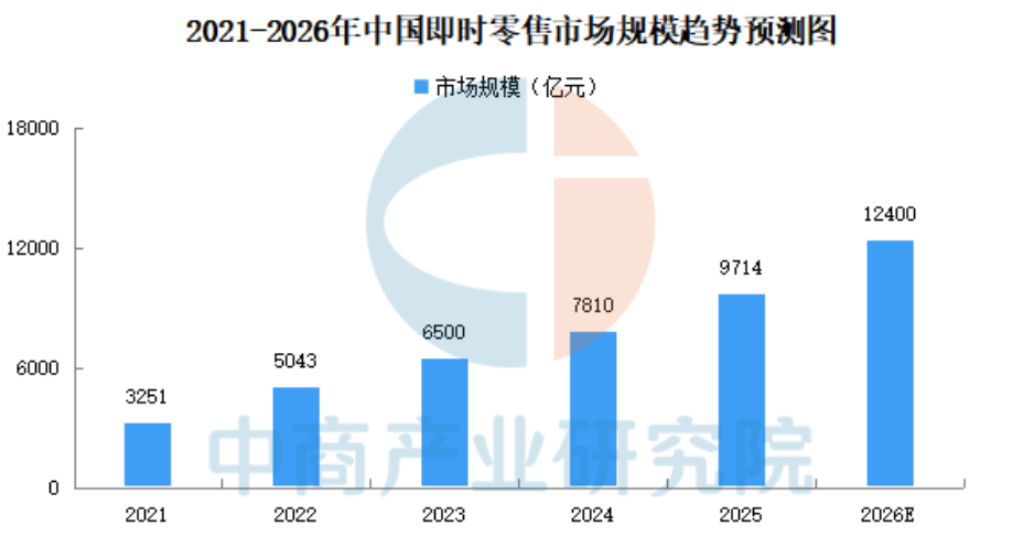 研判盒马的处境必须将视线放到国内整个即时零售战场上来。据调研机构中商产业研究院数据,国内即时零售市场规模2024年达7810亿元,同比增长20.15%;2025年为9714亿元,同比增长24.38%;预计2026年将同比增长23.53%至1.2万亿元,2021-2026年的5年复合年均增长率(CAGR)为30.70%。