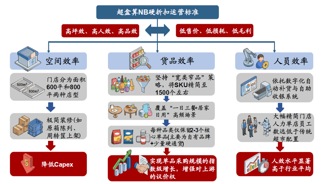 广发证券在2026年1月28日发布的一份研报中测算,超盒算NB门店单店日均GMV可达12万-15万元,月营收约360万-450万元,年坪效约为每平方米6万-7万元,显著优于传统社区超市的3万-4万元;预计超盒算NB未来能够保持2025年高达85%的门店数量增速,有望成为国内硬折扣赛道头部企业。