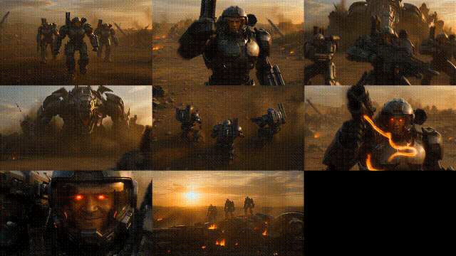 来看生成结果,其运用多格分镜,讲述了一个起承转合完整的“废土机甲小队突袭强敌”的微型故事。从环境铺垫到遭遇强敌、战术动作、关键攻击,再到爆炸高潮和战后余韵,叙事流畅,节奏分明,极具电影感和沉浸感。