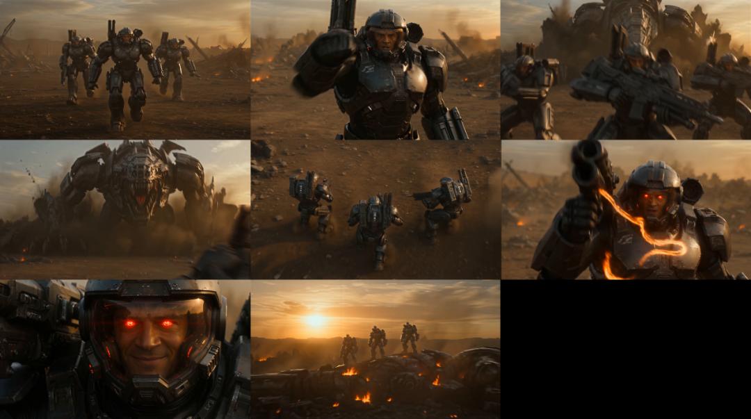 给出“废土机甲小队突袭战术”九宫格分镜,要求模型识别内容,并将其转化为一段15秒、转场自然、动作连贯的完整短片。