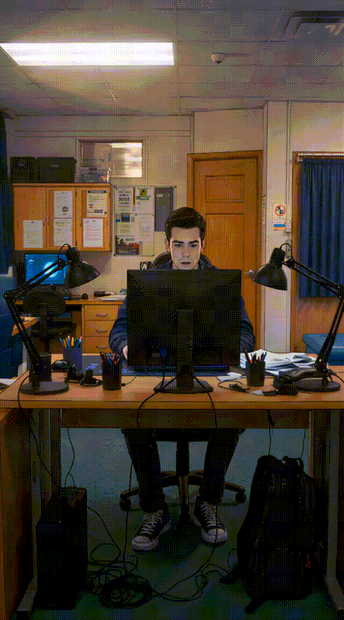 系统面板出现时的光粒汇聚效果、环境光线的自适应变暗、面板蓝光的呼吸式闪烁,将虚拟界面的交互感展现得淋漓尽致。同时,男生的表情从困惑到震惊的过渡自然流畅。