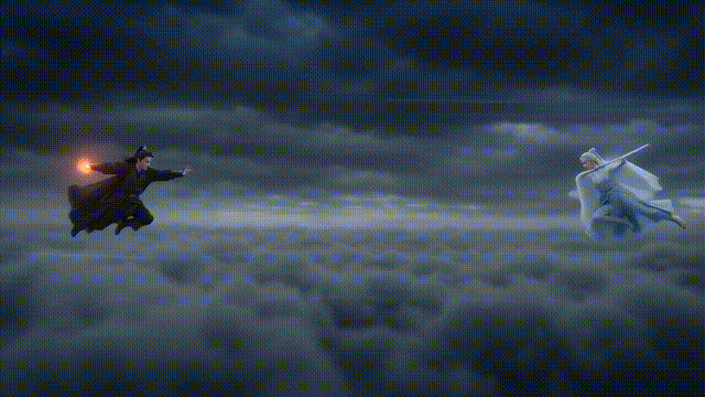 两名武侠在空中对决,一人施火球术,一人使冰霜剑诀,要求展现法术碰撞的粒子爆炸、符合物理的衣袂飘动,以及“子弹时间”环绕接快速拉远的专业运镜。