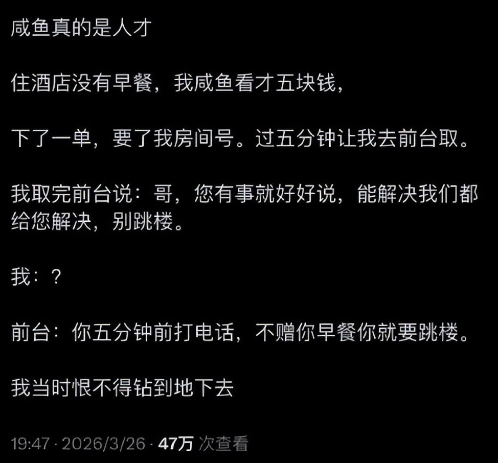 有网友吐槽住酒店没早餐,看到闲鱼上有人卖这家酒店的早餐,只要5元,试试也不亏。结果下单没几分钟,前台就打电话过来请他去取早餐,还小心翼翼地劝道:“哥,有事好好说,别一个电话打过来,说不送早餐就跳楼。”