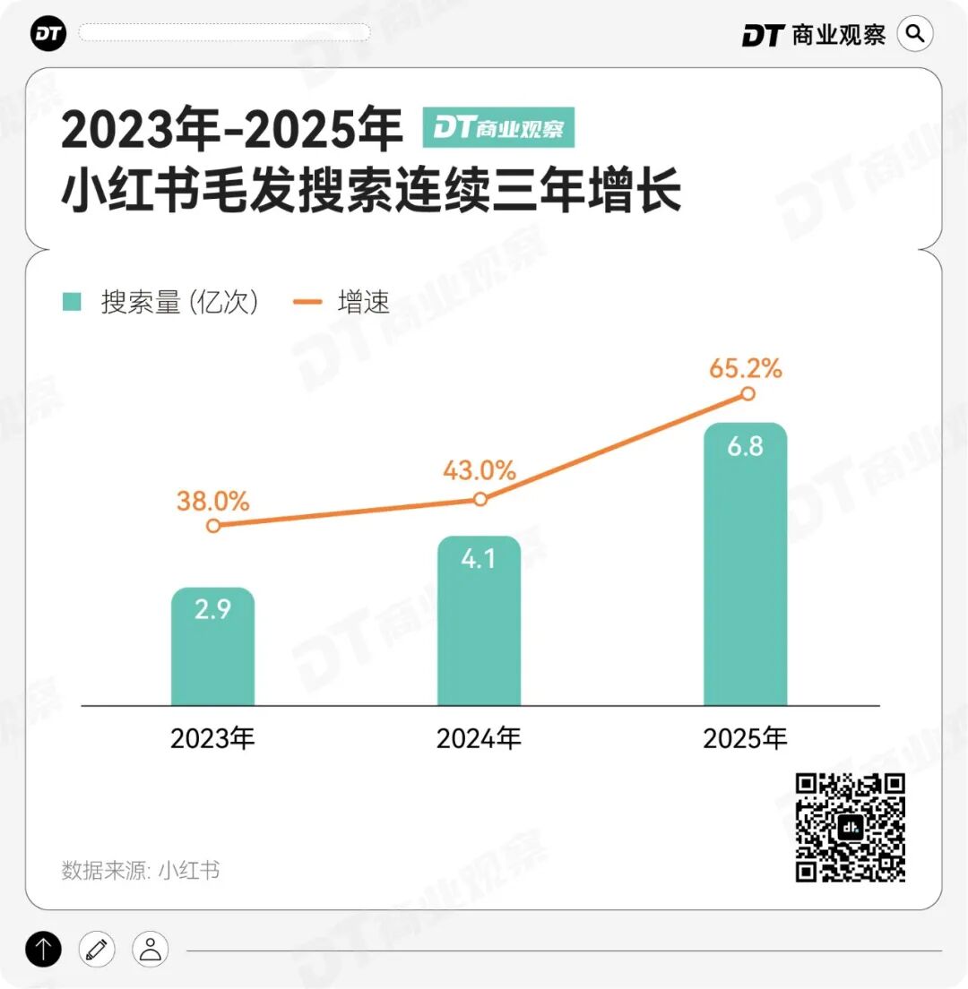 2025年,小红书毛发相关内容搜索增速达65%,已连续三年保持高增长。其中,“植发”成为一个高热度话题,植发真心话相关笔记量增长852%。
