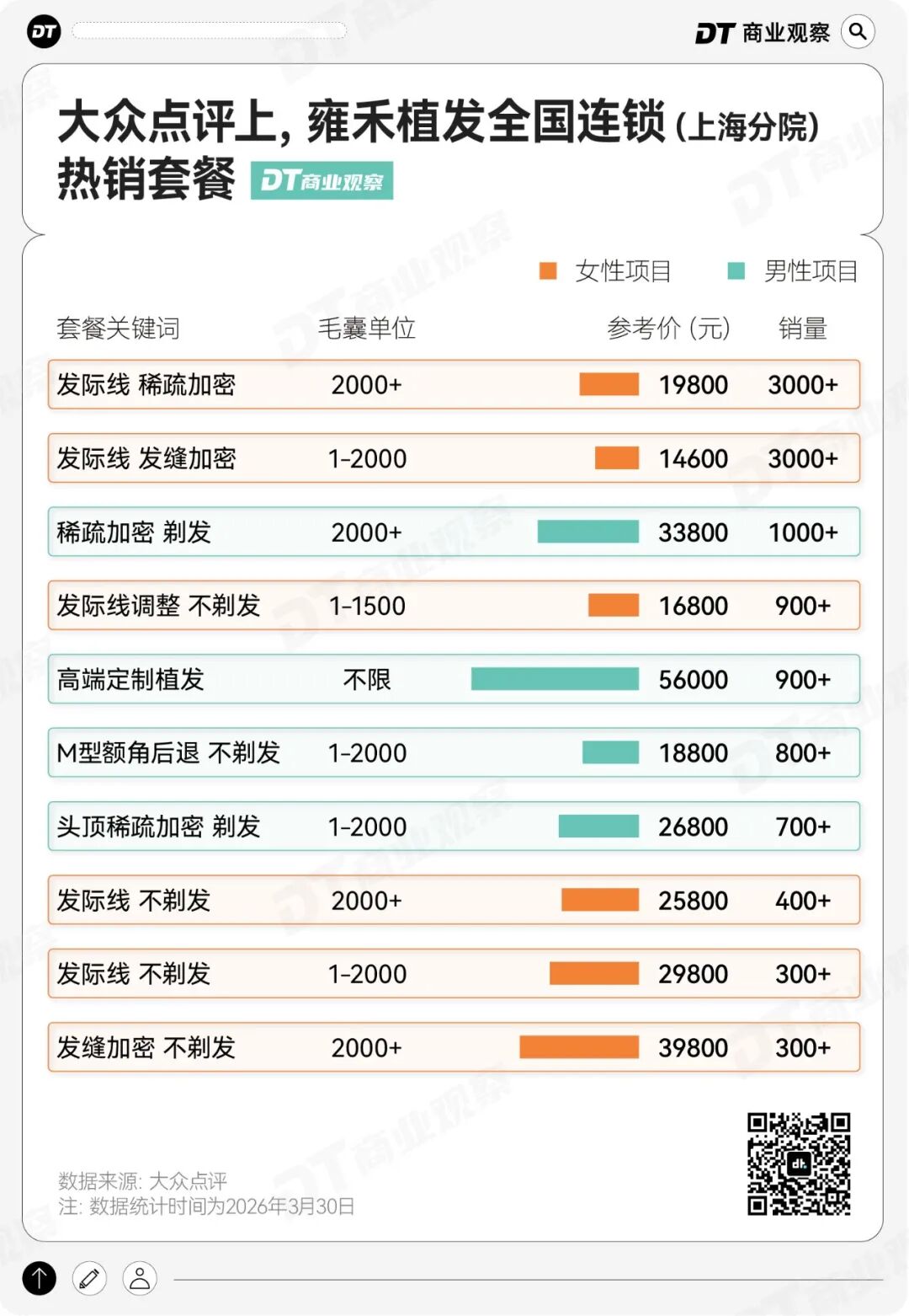 以2026年3月大众点评雍禾植发上海分院的数据为参考,目前店内销量TOP2套餐,均为针对女性的发际线植发项目,而且套餐价格都在2万元以内,低于同等毛囊单位下的男性植发套餐价格。(具体成交价格或有浮动,该价格可作市场参考)
