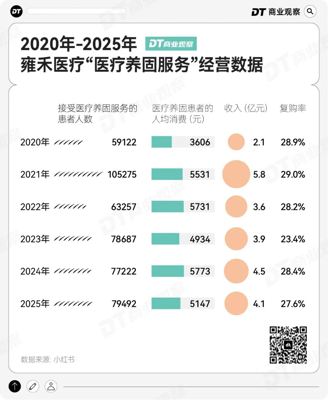 2025年,雍禾医疗的医疗养固业务消费人数为7.9万,虽然超过了植发消费人数的7.1万,但同比2024年只增加了约2000人,远低于同期植发新增的1万人。