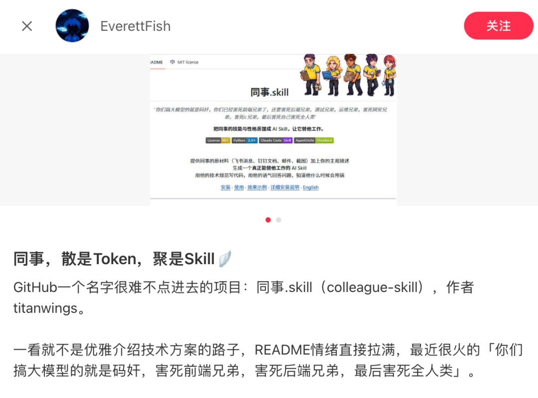“同事,散是Token,聚是Skill”网友的这句调侃更是扎心又好笑。