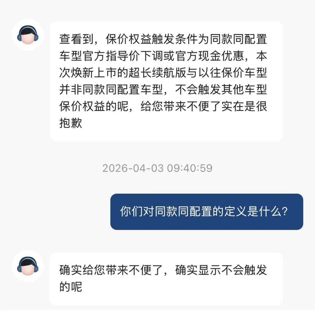 电厂就此情况向深蓝汽车的官方客服进行询问,得到了类似的回复,客服称:“本次焕新上市的超长续航版与以往保价车型并非同款同配置车型,不会触发其他车型保价权益。”
