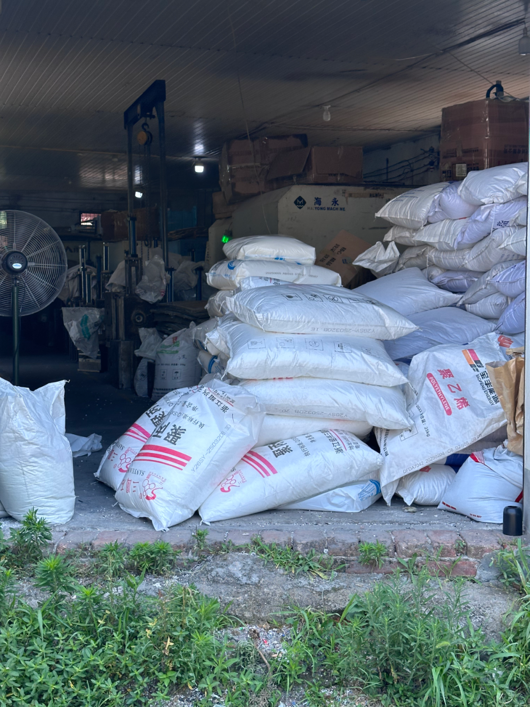 浙江义乌一处厂房里堆放的聚丙烯、聚乙烯等原材料。摄影:李丹